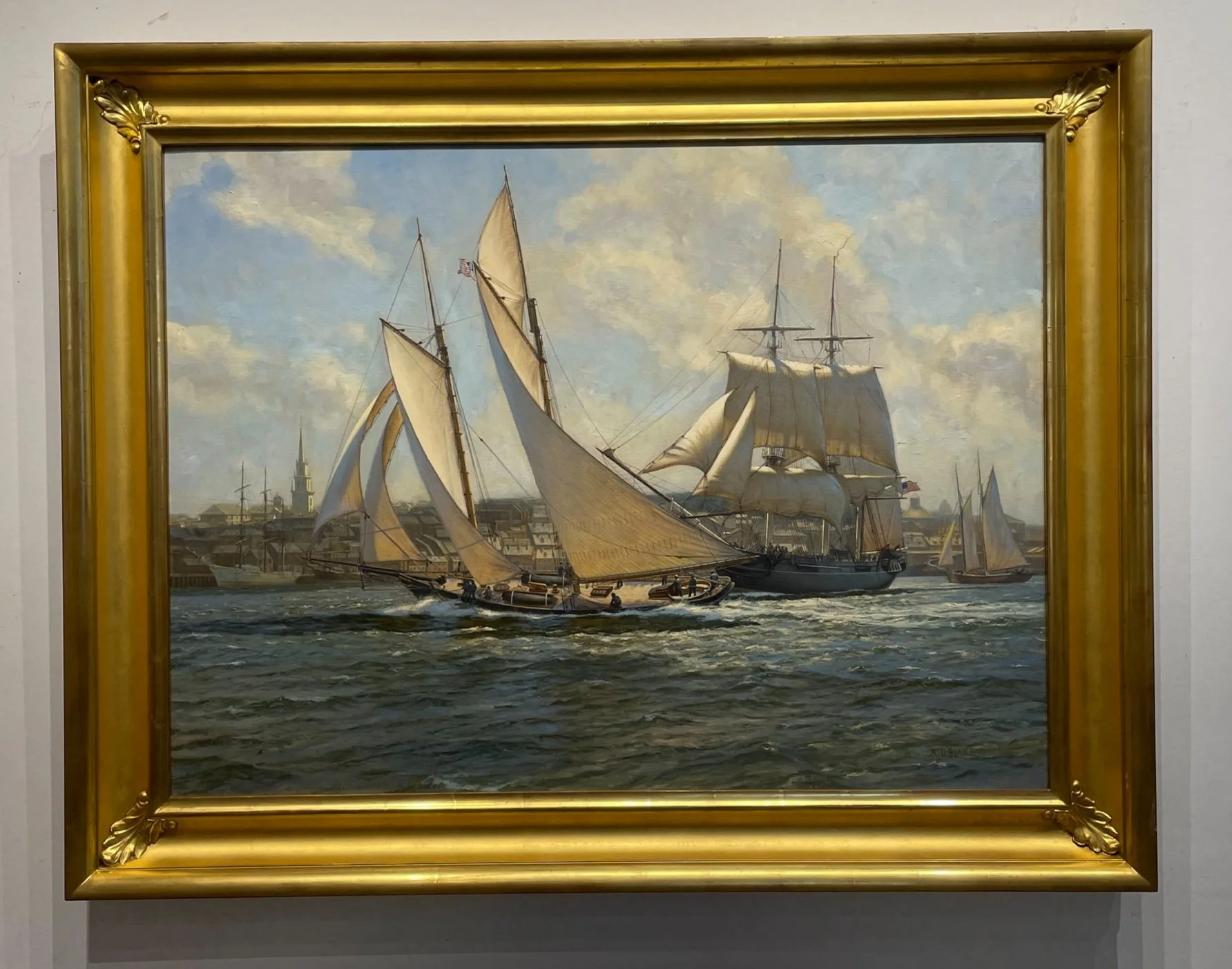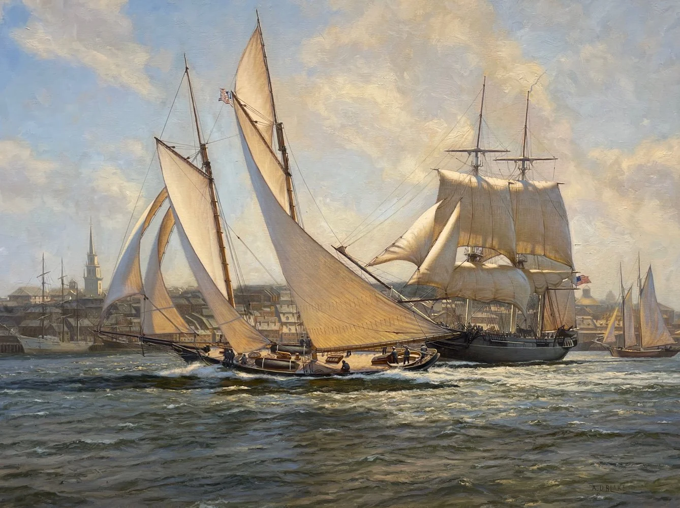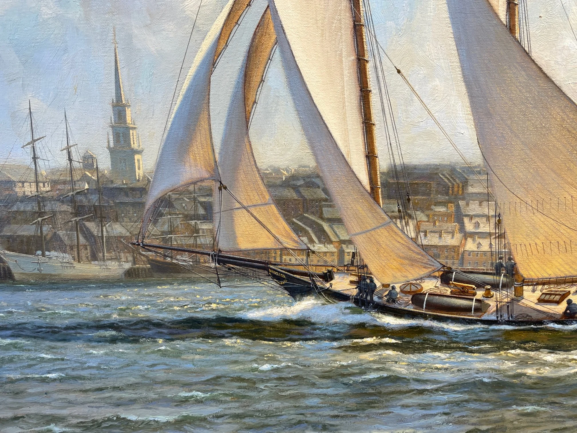 In 1863, America and the Sloop of War Marion visited Boston Harbor, as a part of a United States Naval Academy Cruise for training midshipmen. In this painting Schooner America, distinguished by her unique round cockpit, with all her sails pulling hard in the fresh breeze sails across the bow of sloop of war Marion, which was stationed in Newport along with the sloop of war Macedonian. Marion is still busy lowering her foresail and mainsail and hoisting one of her jibs. She is sailing under a reduced rig with no yards "crossed' on the topmast sections. On board America can be seen the 24 pounder Dahlgren deck guns that she carried to apprehend Confederate blockade runners. Sections of her deck are wet from water splashing aboard. Crew are hauling in the jib sheet on the port side for'ard. A cloud casts a shadow on the foreground water but sunlight lights up the water around America. and Marion, and creates a wonderful glow through America's cotton sails.