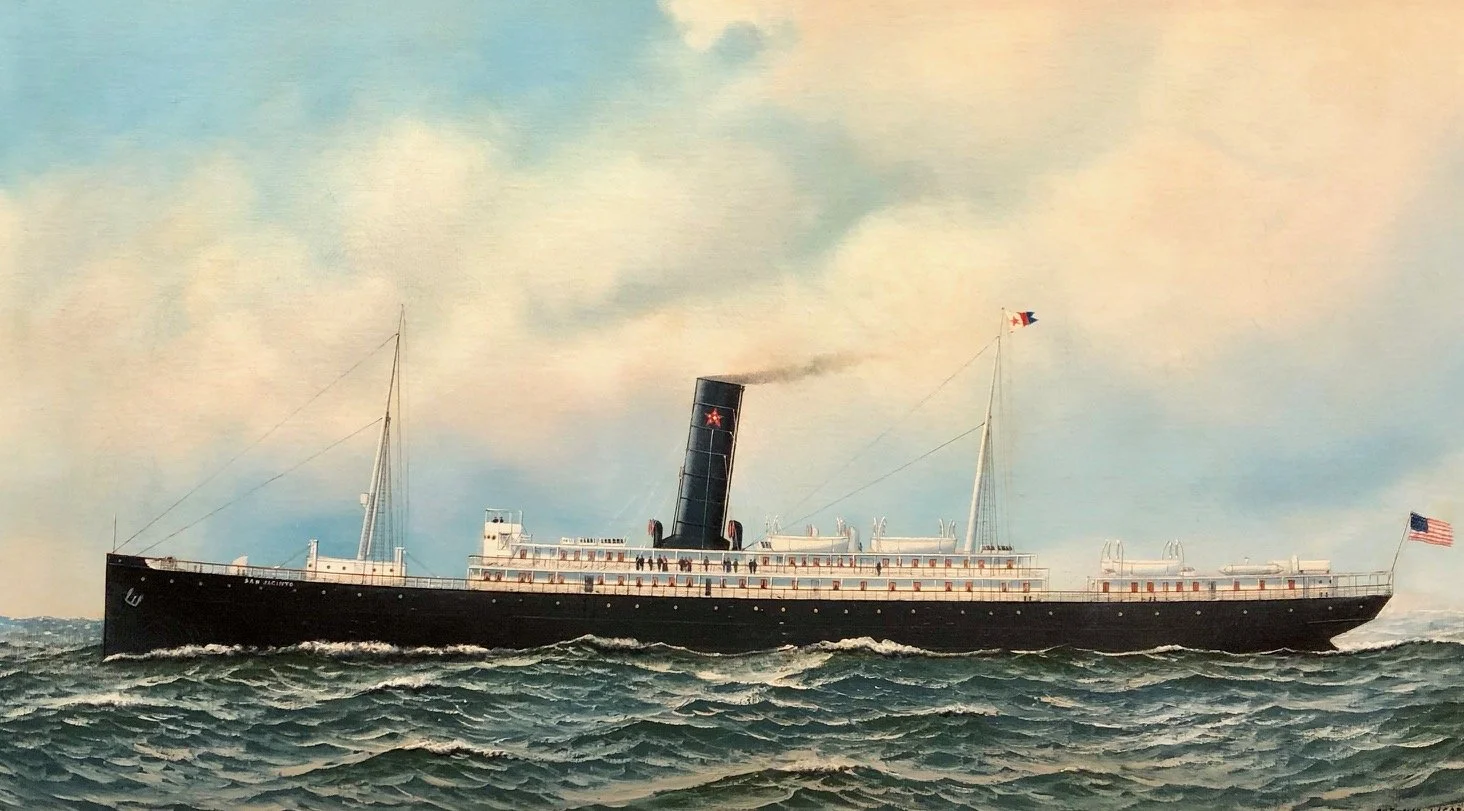 Steamship San Jacinto was built for the Mallory Steamship Company in 1903 for the Galveston to Key West to New York City run. She was large, 6,069 gross tons, 380 feet long and her double steam engines allowed her to steam at 15 knots. She served this route until 1942 when she was torpedoed and sunk by German U-Boat 201 off the Bahamas.