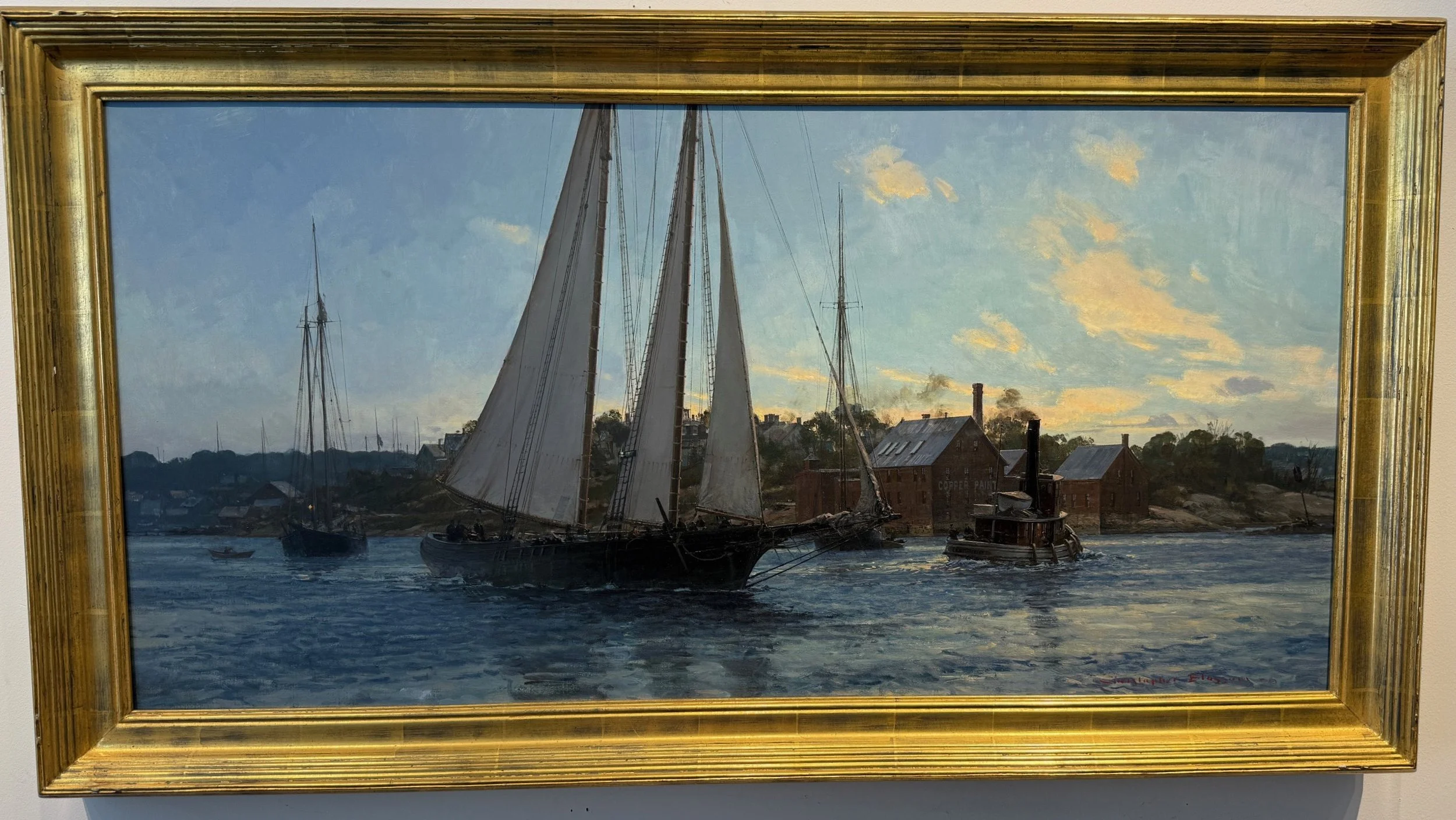 The ARTHUR JAMES is seen here after dropping the tow from the inner harbor of Gloucester at dawn and bound out past the famous landmark copper paint factory on Rocky Neck.