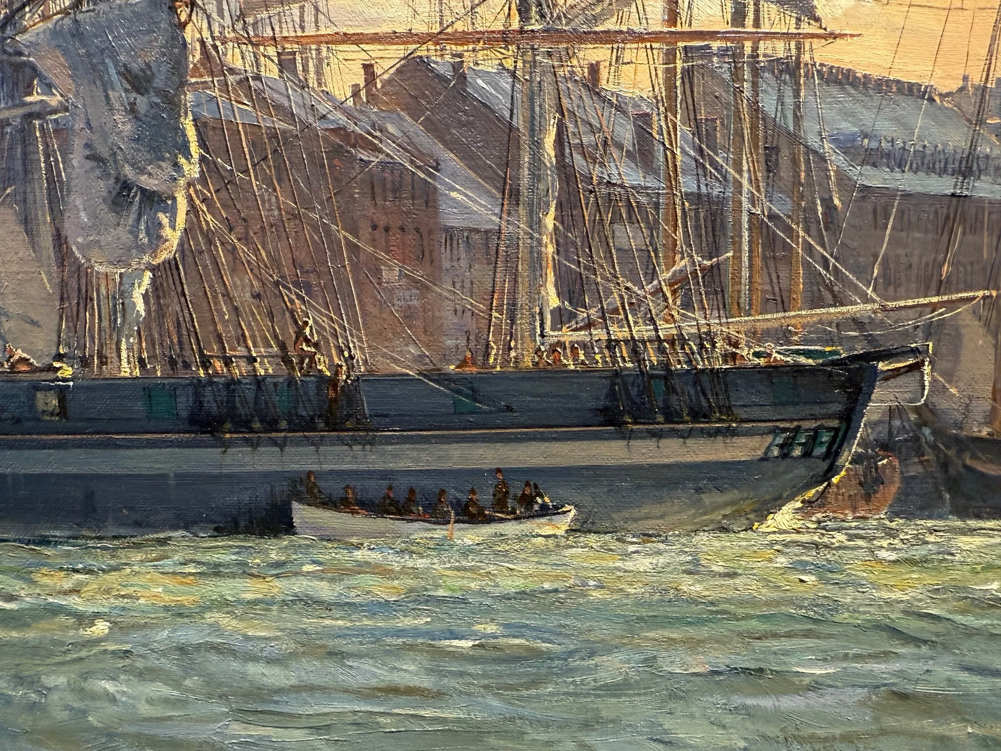 In this panoramic painting, Blossom shows the Packetship UNITED STATES departing for her scheduled run to England, in a busy Boston Harbor. The Harbor had over 80 wharves in the early 1800s as the city remained a major commercial hub. The UNITED STATES is seen just dropping off the warping buoy located off the end of the dock. She would have passed a hawser out from the wharf to the buoy to haul herself out in preparation for getting underway. As she lets go of her hawser, she gathers sternway to swing her bow towards sea on a starboard tack. She has braced around her fore, and mizzen yards, and has only to brace around her main yards to be fully underway, but in the meantime, one more boat is alongside with perhaps a last-minute passenger or mail for England.