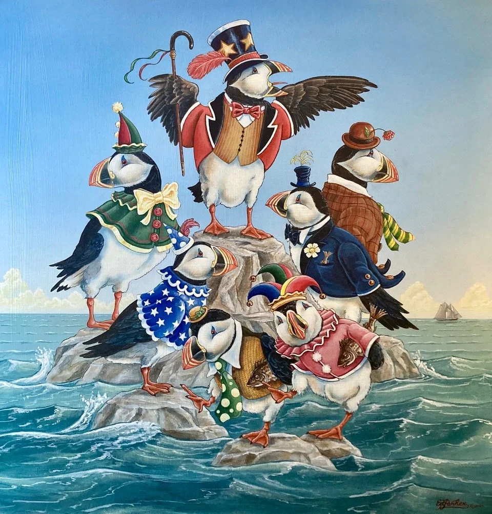Puffins are charismatic seabirds known for their colorful beaks and quirky appearance, often nicknamed "clowns of the sea". They are skilled divers and swimmers, spending most of their lives at sea, and are also known for their unique breeding habits and long-term pair bonds. In 1973 a group called The Puffin Project successfully transplanted a group of young Puffins to a group of islands off the coast of Maine. Islands where they had been killed off by hunters for their feathers in the 1800’s. The birds breed and raise their young on those coastal islands and then spend the rest of the year at sea. No one knows exactly where. Given their “clowns” nickname it is not surprising that a group of Puffins are called “A Circus” and since we don’t know where they go when out to sea and out of sight, I have imagined them dressed up and performing for their own amusement.
