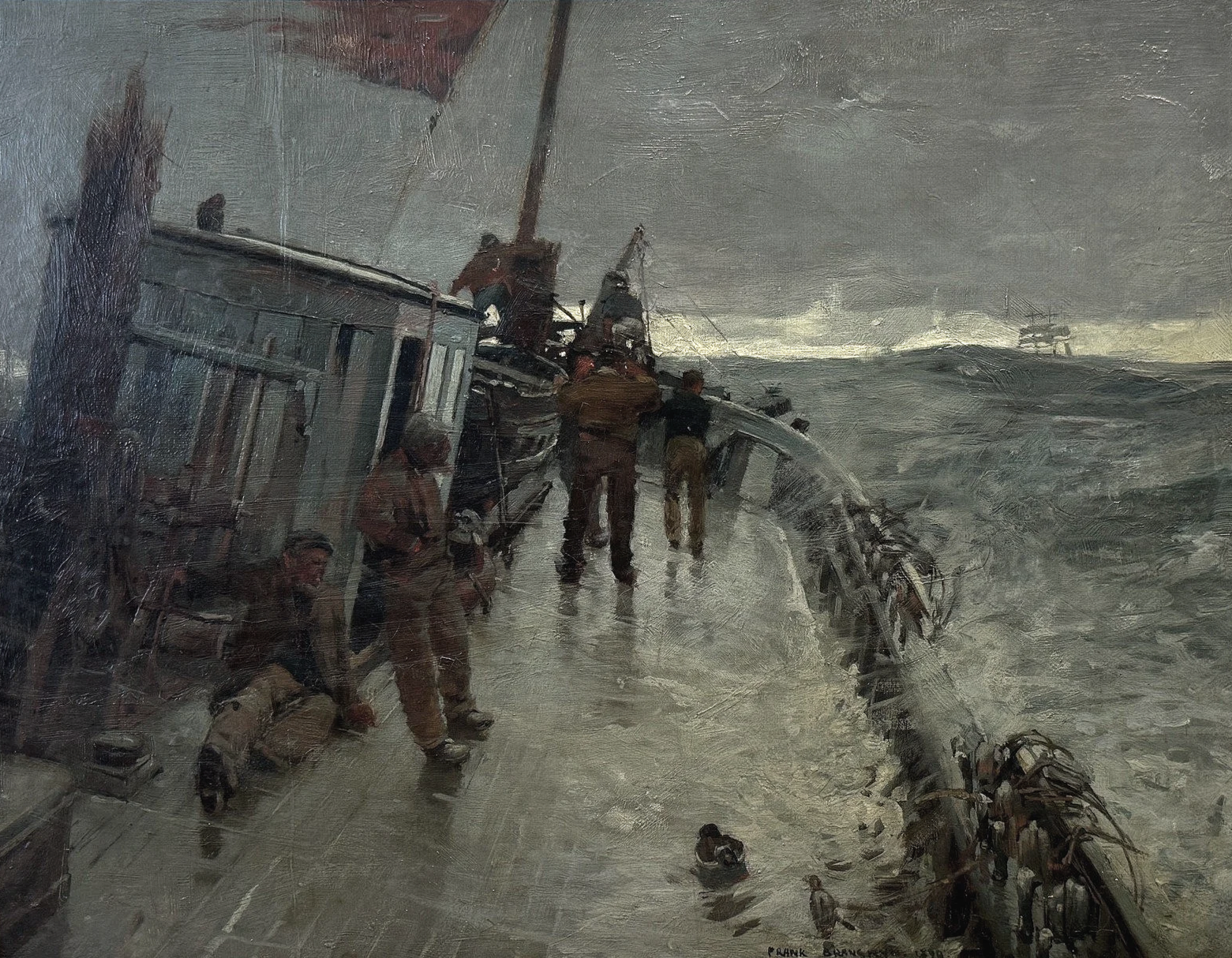 Frank Brangwyn first worked as an assistant to his father, William Brangwyn, who was a church architect and textile designer in Bruges. He studied briefly at the Royal College of Art in South Kensington, London, during the 1870s, and from 1882 to 1884 worked in William Morris’s studio at Merton Abbey, designing tapestries. His early paintings show the influence of Millet and of Dutch and Belgian Realists, while a series painted in Cornwall during the mid 1880s (exhibited at the Royal Academy and the Royal Society of British Artists, London) show the growing influence of the Pre-Raphaelites and Whistler. Journeys to the Middle East, Algeria, Morocco, South Africa and Japan in the early 1890s gave him a taste for exoticism, and led him to employ a brighter palette ( Slave Market, 1892; Atkinson Art Gallery, Stockport) and to move decisively to Symbolism and above all Art Nouveau.