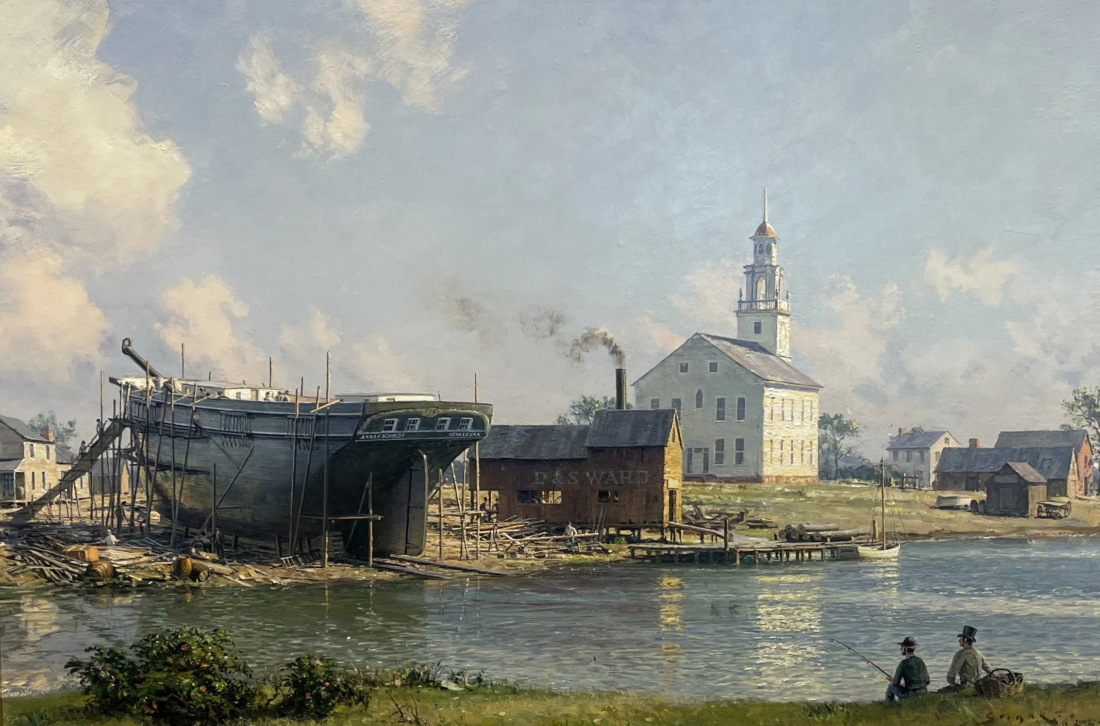 The origination of this painting is a perfect example of Stobart’s ability to transport us into the past. Given as a gift several pages of the ship's manifest of the ANNA F. SCHMIDT, Stobart began to imagine what the building of her might have been like in 1854. Using a vintage map of Kennebunkport, where she had been built, as well as early etchings of the area, he set about re-creating the Daniel and Stephen Ward shipyard. Just above the Congregational Church (still standing today) on the east bank of the Kennebunkport River where the construction of the 162 foot vessel took place. This painting is a charming vignette of New England life in 19th century Maine. As shipyard workers are beginning to remove the scaffolding around the ship while two men sit across the bank fishing and watching the events. Notable in the scene is the lack of trees, as most were cut down to use in the buildings of the ship!