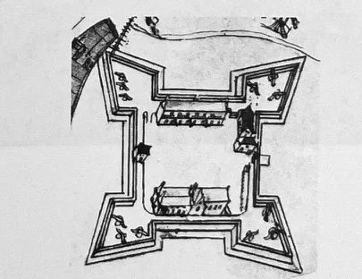 Redrawn plan made from the original English drawing which was to scale with dimensions, circa 1700. Note the entrance and building locations are exactly the same as the detail from the Castello Plan.