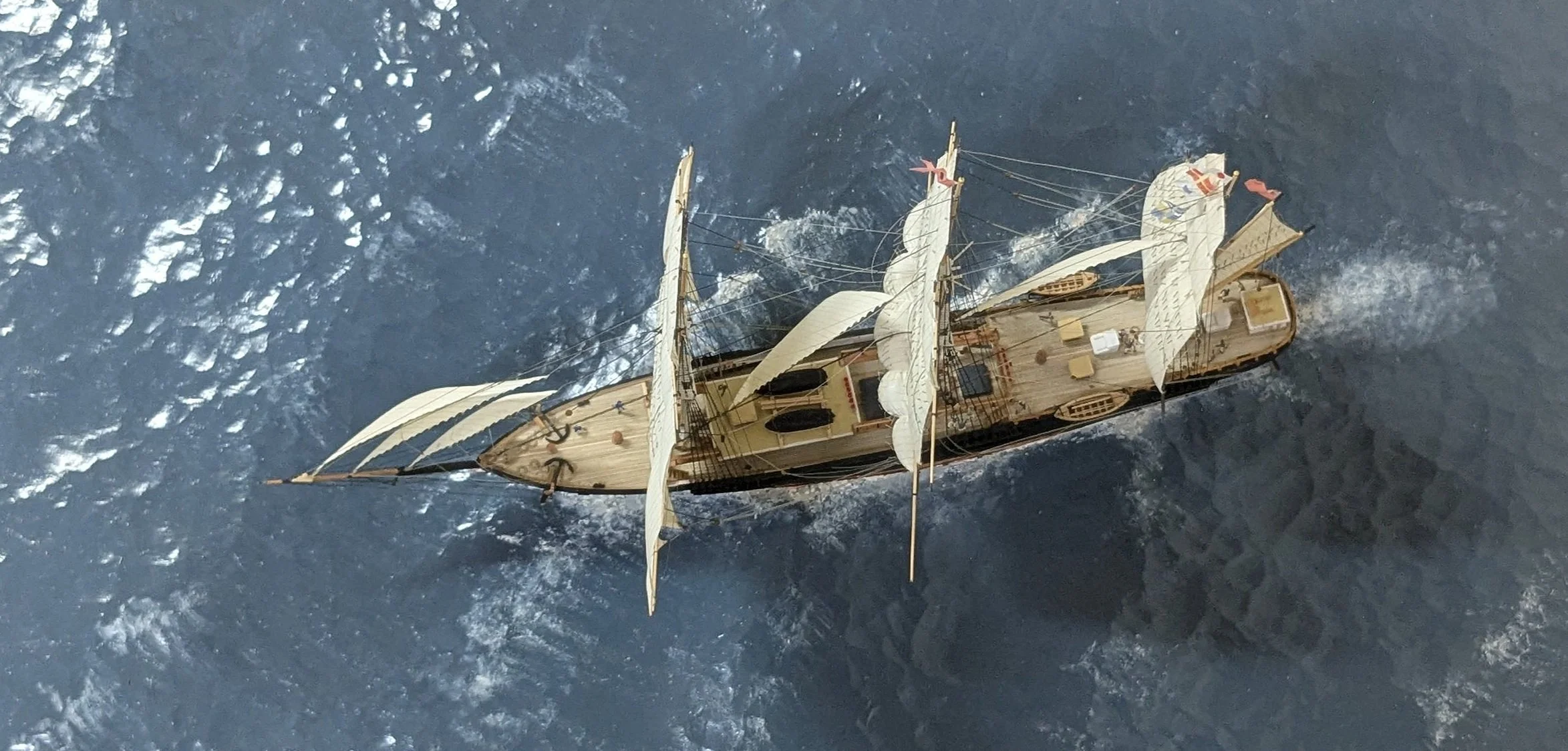 His model shows wind from the port quarter, the ship is on the port tack, the sea was carved to represent a Beaufort force two , almost three. “Small wavelets, crests glassy, no breaking waves". Force three would be “gentle breeze, large wavelets, crests beginning to break.”