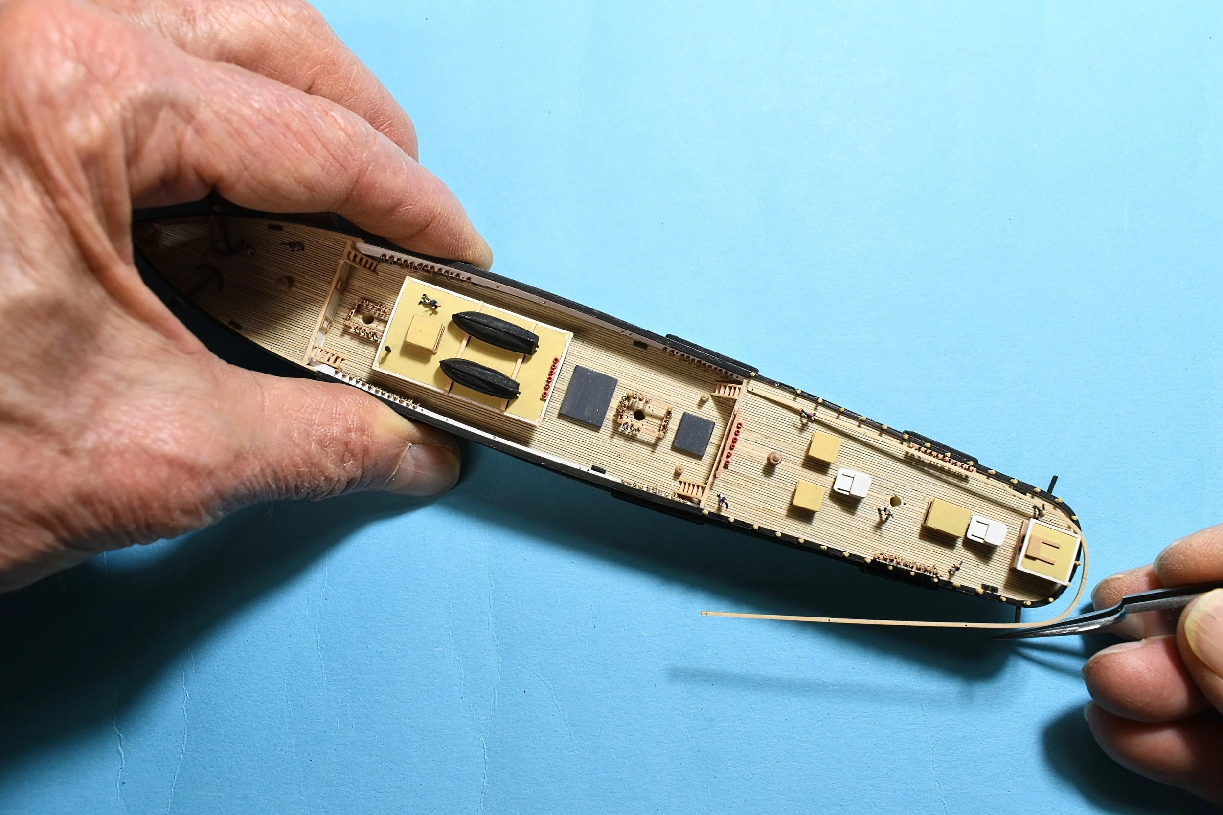 Fittings: The deck houses were built up of Bristol board and lilac . All fittings, such as capstans, skylights, anchors, boats, figurehead, and gangways are shown. The railing around the stern is mounted on turned stanchions, each turned on a lathe, and are 3/32” high, not including the tenons. The railing is pinned to these stanchions. The are five nameboards: two port and starboard at the bow, two on each quarter, and one on the stern. These are hand painted and gilded with 24k. gold leaf. The letters are 1/32” high.