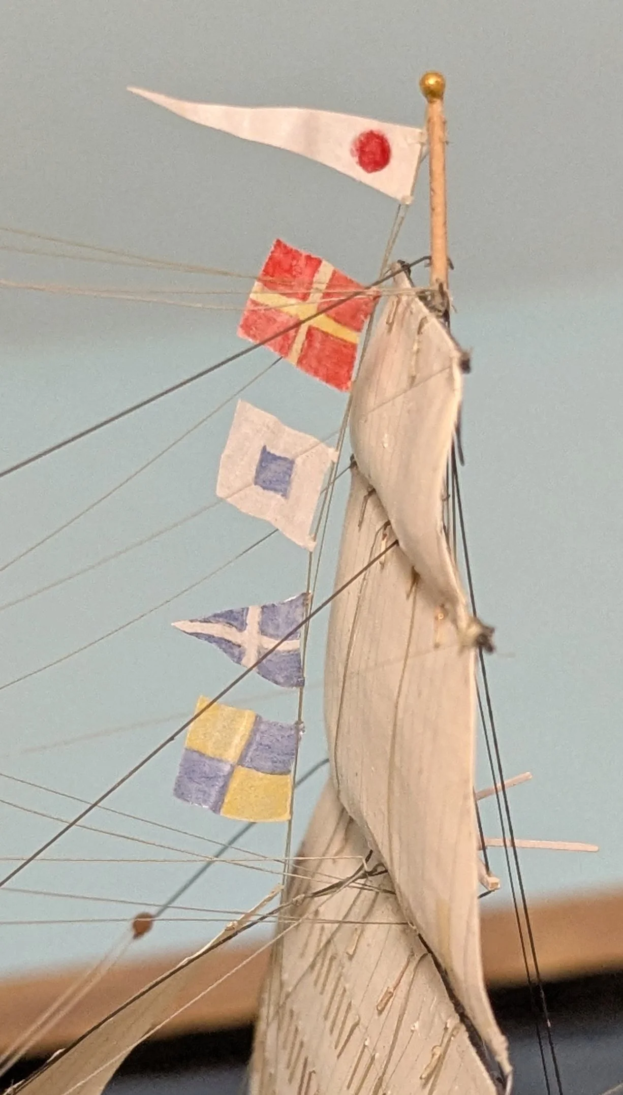 Rigging: The masts and yards are made of Degama (Calicophylum candidisimum), with the upper spars of lilac. The lower masts are built up, showing fillets bound by iron hoops, all painted white. Stunsail booms and yards are of Degama, with boom irons of brass. All three masts are surmounted by spherical trucks, with the main mast having Harris’s LIGHTNING arrestors. All sails are properly formed and fitted using glassine, a neutral pH paper. with all buntlines, reef points, and gaskets. All rigging material is wire, using Nichrome for most of it. The ratlines are formed of copper wire. All are painted in appropriate colors for standing and running rigging.