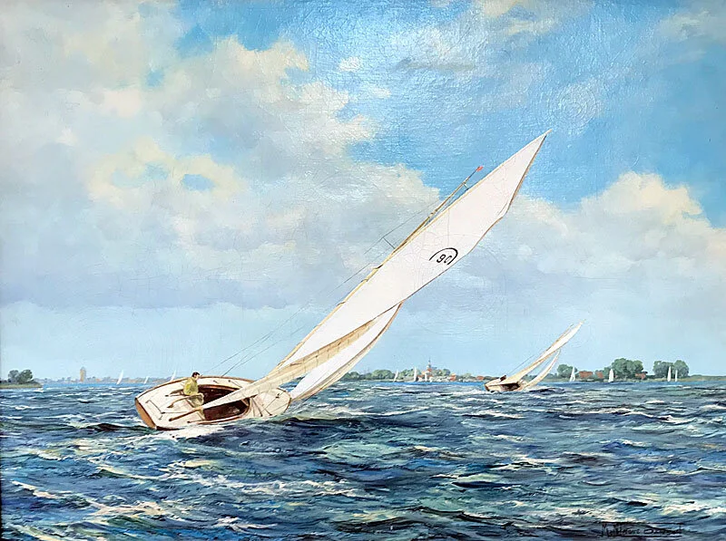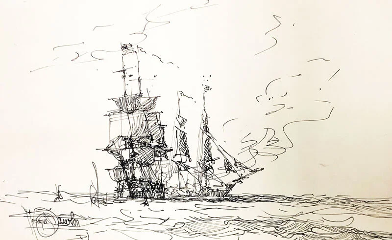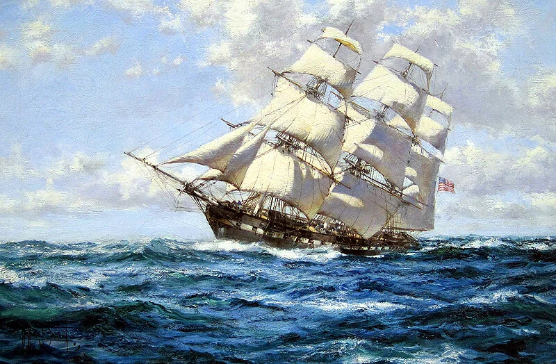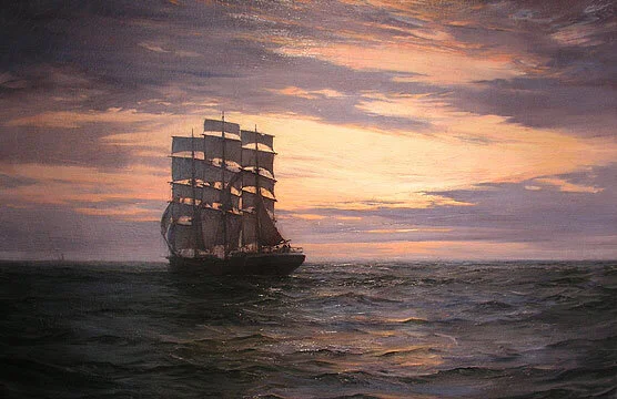 Montague Dawson was the son of a yachtsman and the grandson of the marine painter Henry Dawson (1811-1878). Much of his childhood was spent on Southampton Water where he was able to indulge his interest in the study of ships. For a brief period around 1910 Dawson worked for a commercial art studio in London, but with the outbreak of the First World War he joined the Royal Navy. While serving with the Navy in Falmouth he met Charles Napier Hemy (1841-1917), who became his tutor and considerably influenced his work. Dawson was present at the final surrender of the German Grand Fleet and many of his illustrations depicting the event were published in the magazine Sphere.