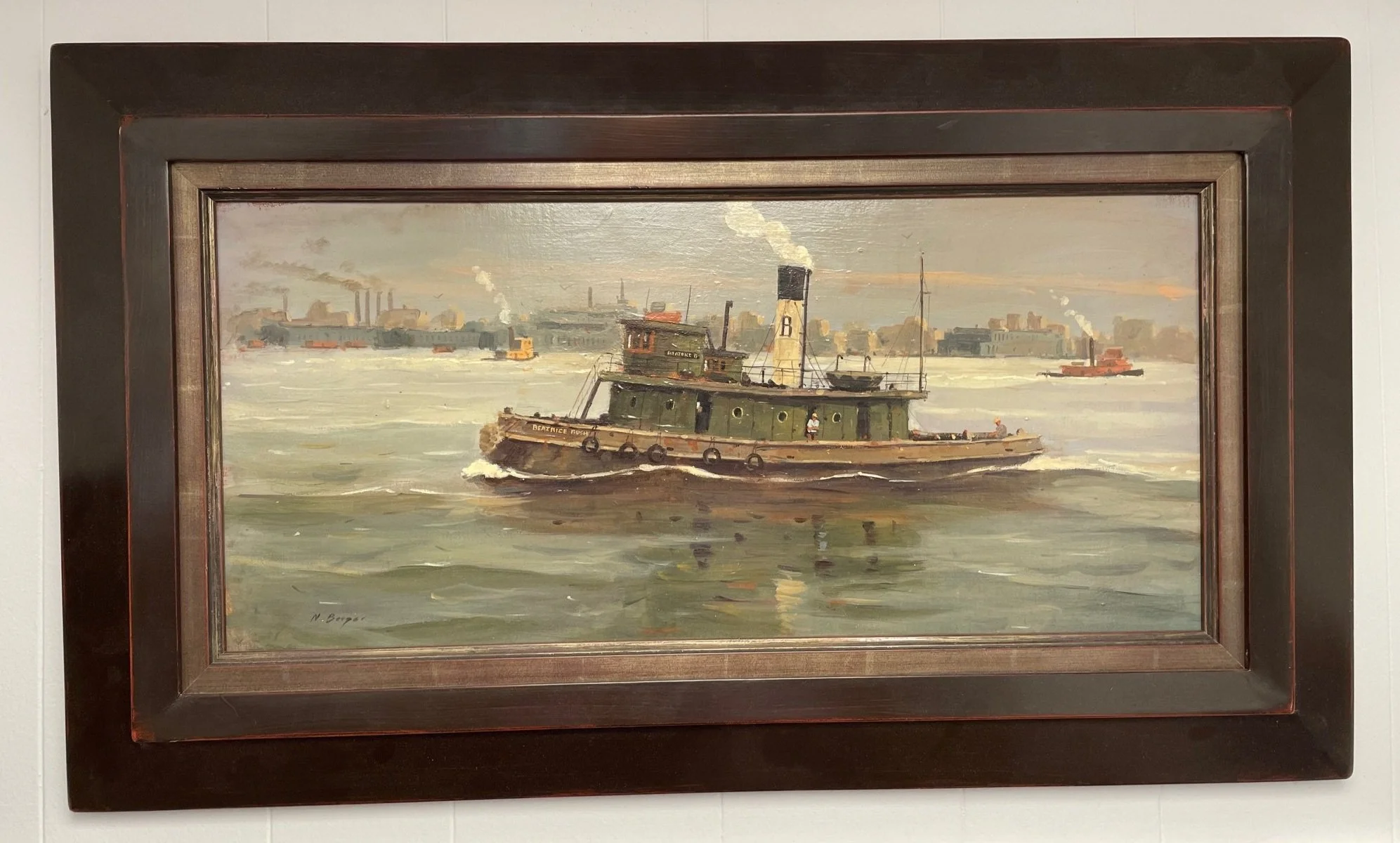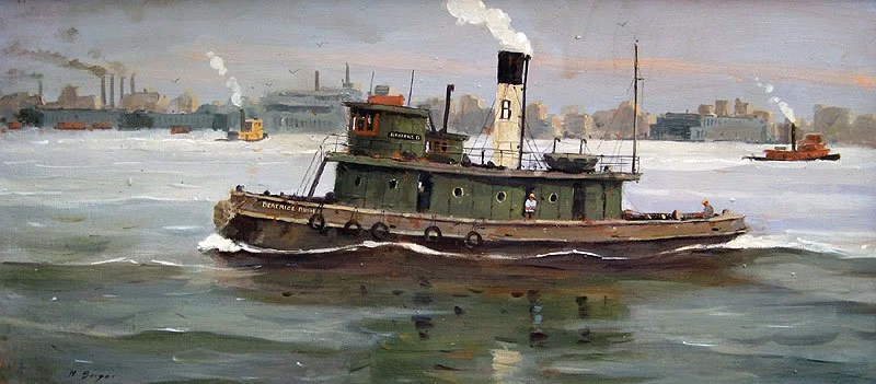 This is a view of the BEATRICE BUSH from Weehawken, New Jersey, looking toward mid-Manhattan. This well-known tug was built in 1905 by Robert Palmer & Sons Shipbuilding Company, Noank, Connecticut. By the late 1950’s the Beatrice Bush was one of the last wooden-hulled tugs still working for a railroad, owned by Bush Terminal Railroad in Brooklyn, NY, and operated until her retirement in 1960. She had a length of 28.95 meters ((95 feet) with a two-cylinder, 75 hp, compound steam engine from Neafie & Levy in Philadelphia, Pennsylvania. On December 16, 1944, she towed out the burning munitions laden SS El Estero from her pier in New York to be scuttled.