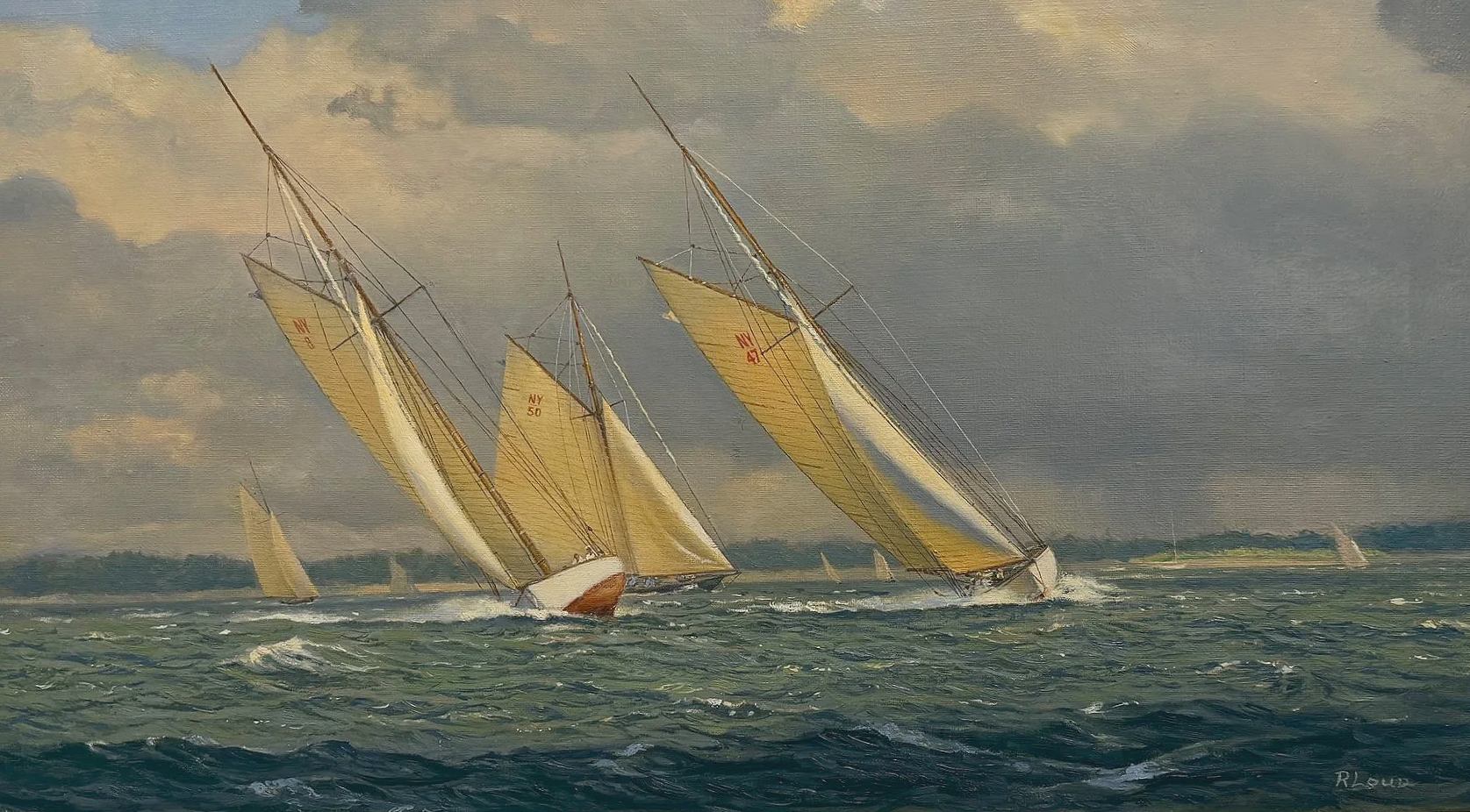 The New York Yacht Club (NYYC) Forties came into existence several years after the NYYC Fifties, around 1917. The Fifties were expensive to run and many owners were looking for a less expensive craft, which is one of the reasons NYYC Forties were designed. In this painting, a raildown summer squall is impending off Long Island and most of the Forties have reduced sail considerably.