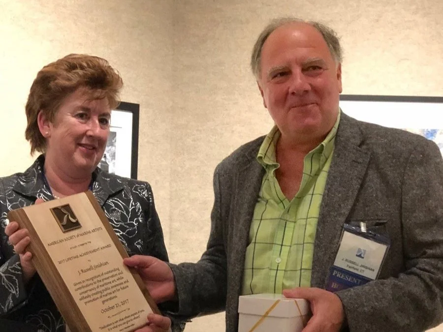 Awarded by The American Society of Marine Artists in 2017, in recognition of Russell’s leadership in the field of marine art (shown above: ASMA President Kim Shaklee and Russell at the Awards Dinner in Mystic, Connecticut).