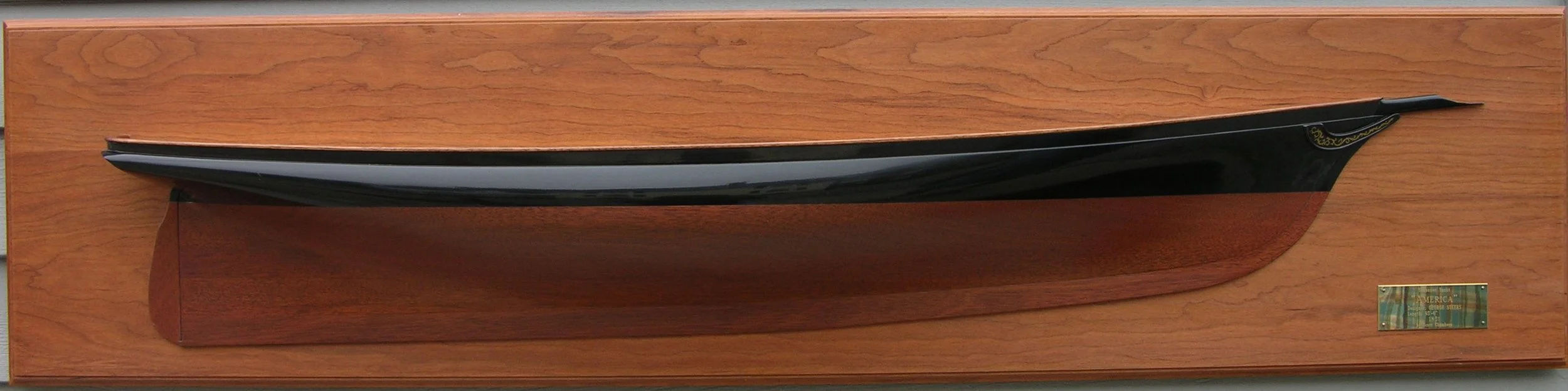 Half Hull scale model; basswood, and Honduras mahogany, mounted on a cherry plaque, 48" L x 11" H x 41/2" D