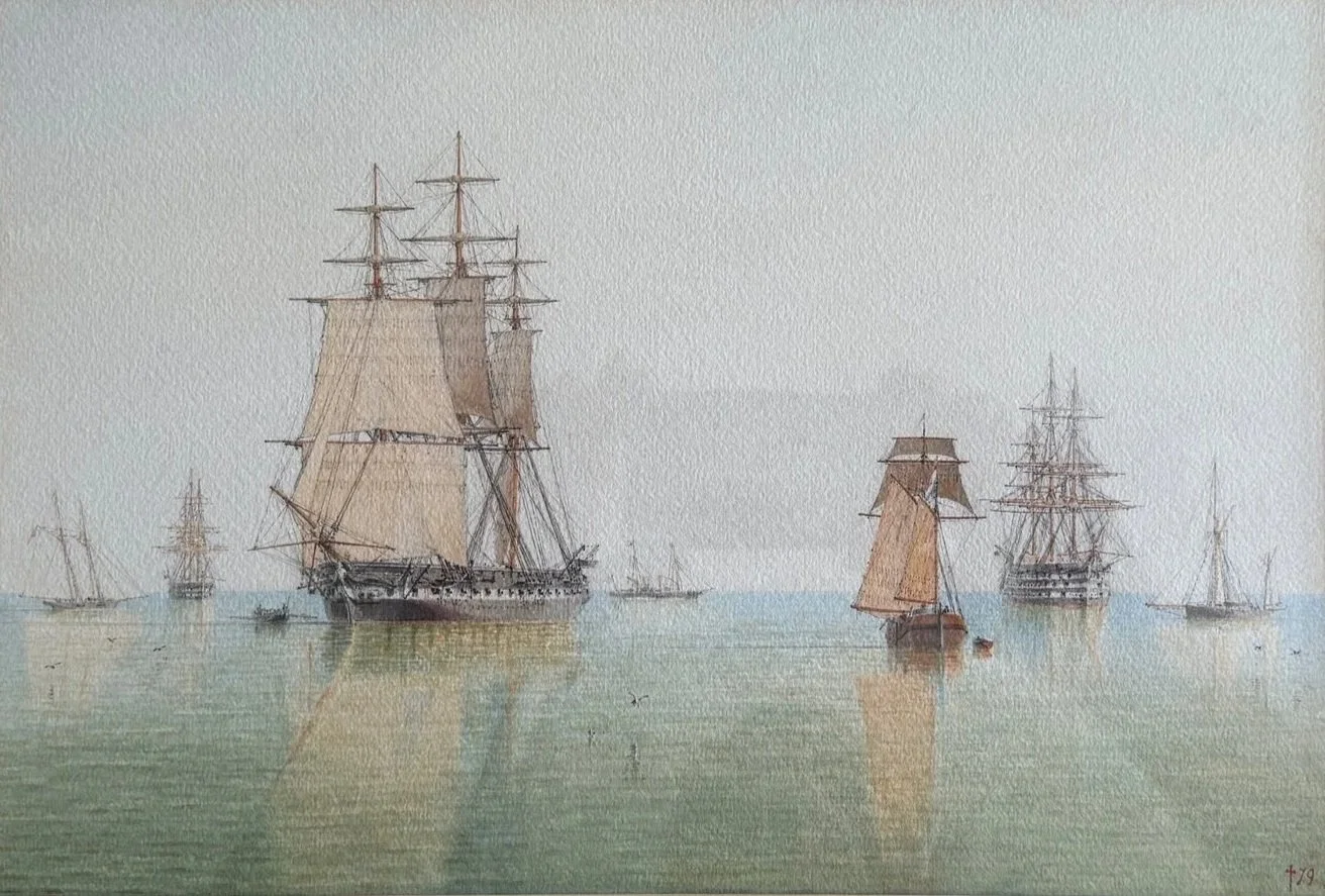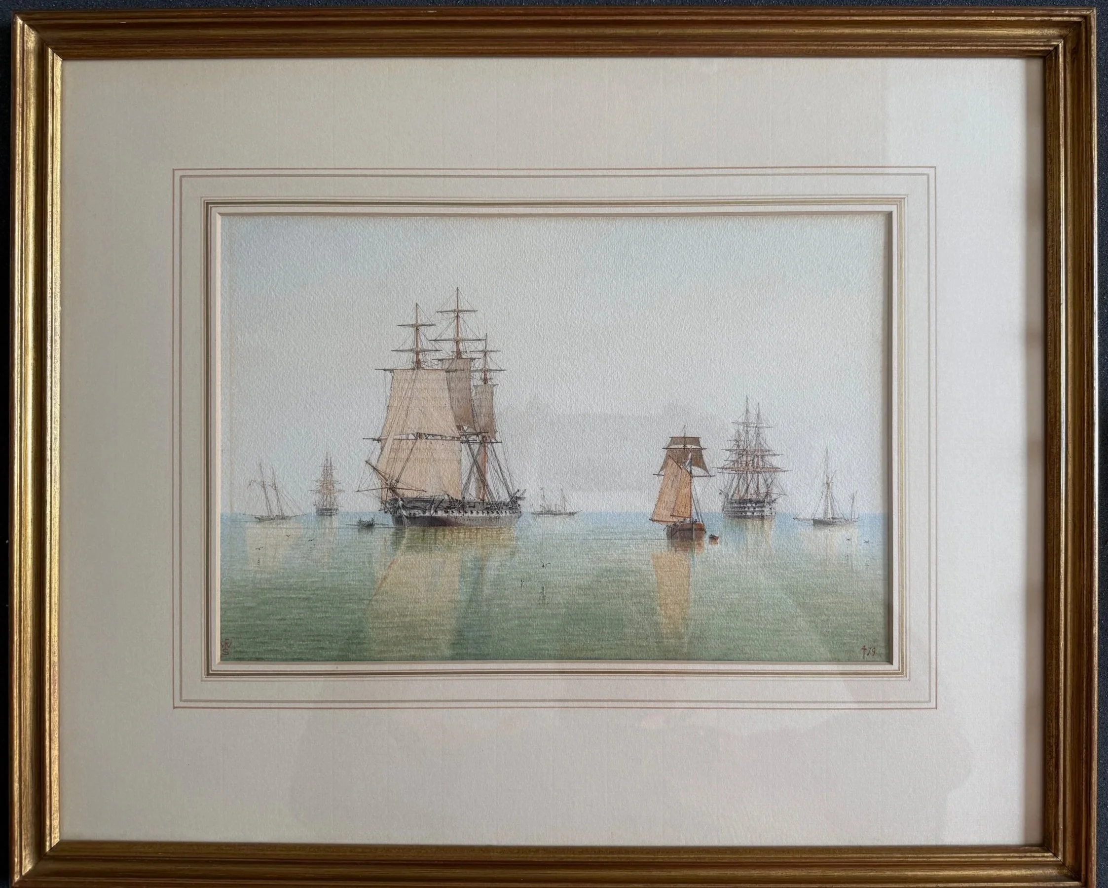 William F. Settle Shipping in an Estuary, 1879 watercolor, 9” x 13” (framed dimensions: 17” x 21”)$2,200