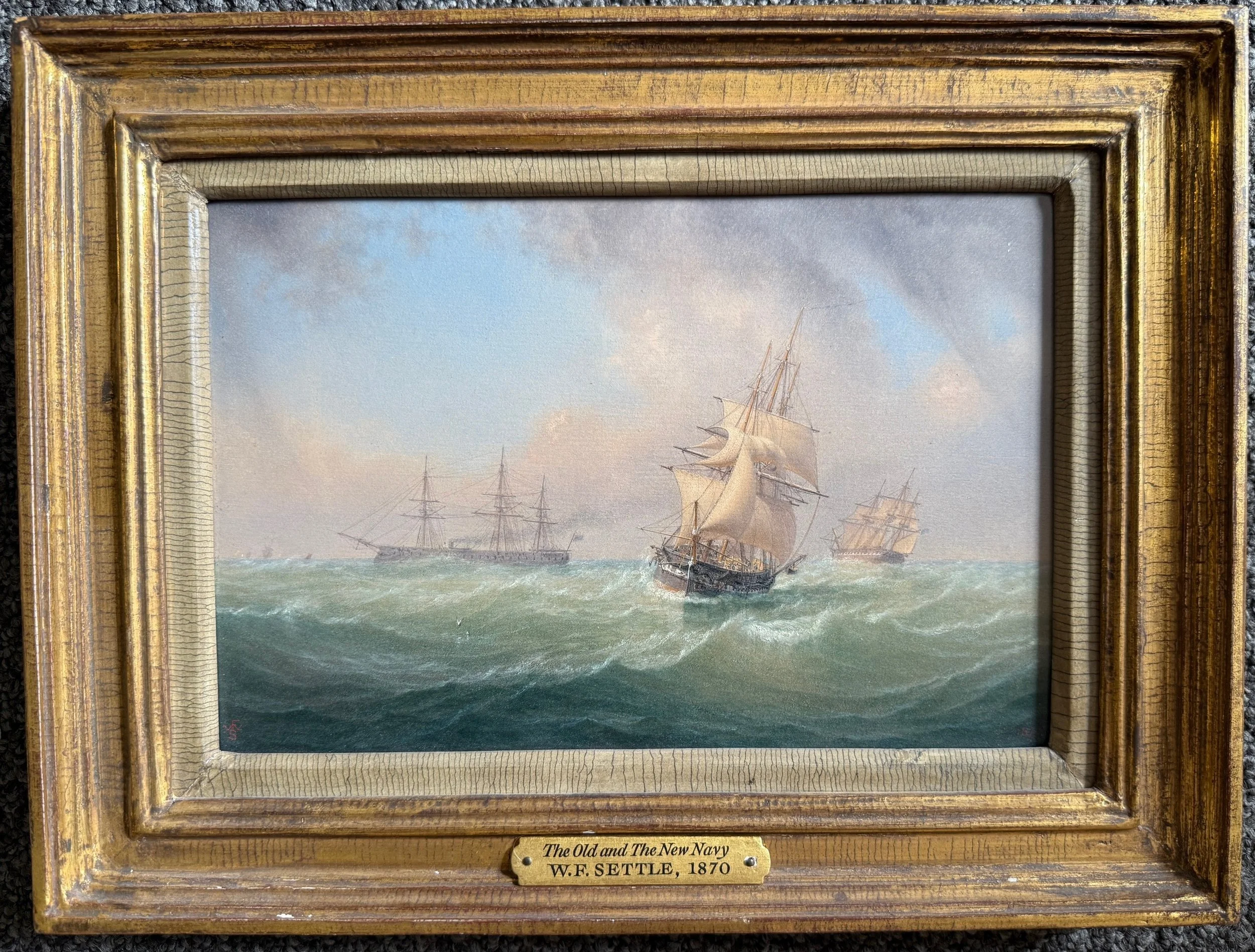 William F. Settle The Old and New Navy, Frigates in Rough Seas, 1870oil on canvas, 6” x 9” (framed dimensions: 9” x 12”)$5,500
